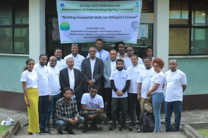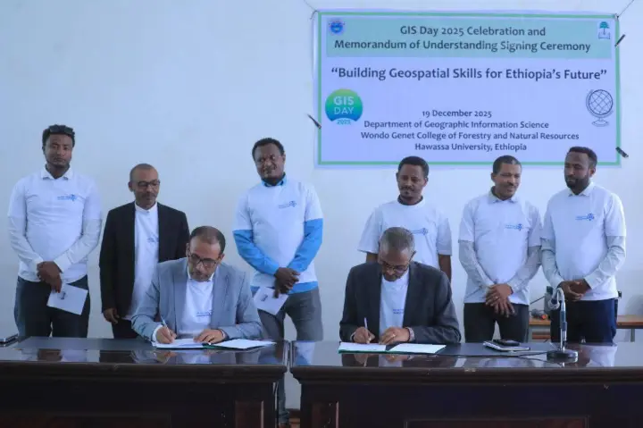 በሀዋሳ ዩኒቨርሲቲ የወንዶ ገነት ደንና ተፈጥሮ ሀብት ኮሌጅ የጂኦግራፊ መረጃ ሥርዓት ት/ክፍል በአለምአቀፍ ደረጃ በየጊዜው በዘርፉ የመጡ ለውጦችና አዳዲስ አሰራሮችን አስመልክቶ ግንዛቤ ለመፍጠር የሚከበረውን የ GIS ቀን ታህሳስ 10/2018 ዓም "Building Geospatial Skills for Ethiopia's Future" በሚል መሪ ቃል ያከበረ ሲሆን በዕለቱ ከአርባምንጭ ዩኒቨርሲቲ ጋር በጋራ ለመስራት የሚያስችለውን የትብብር መግባቢያ ሰነድ ተፈራርሟል።